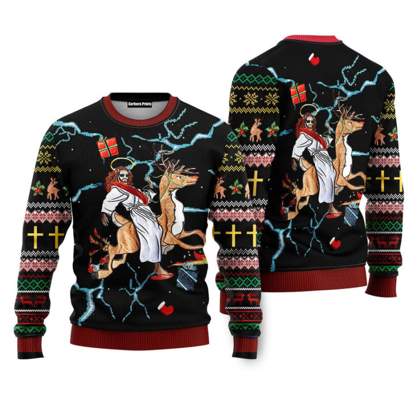 Jesus Riding Reindeer Black Christmas Ugly Christmas Sweater